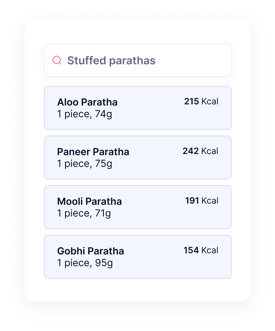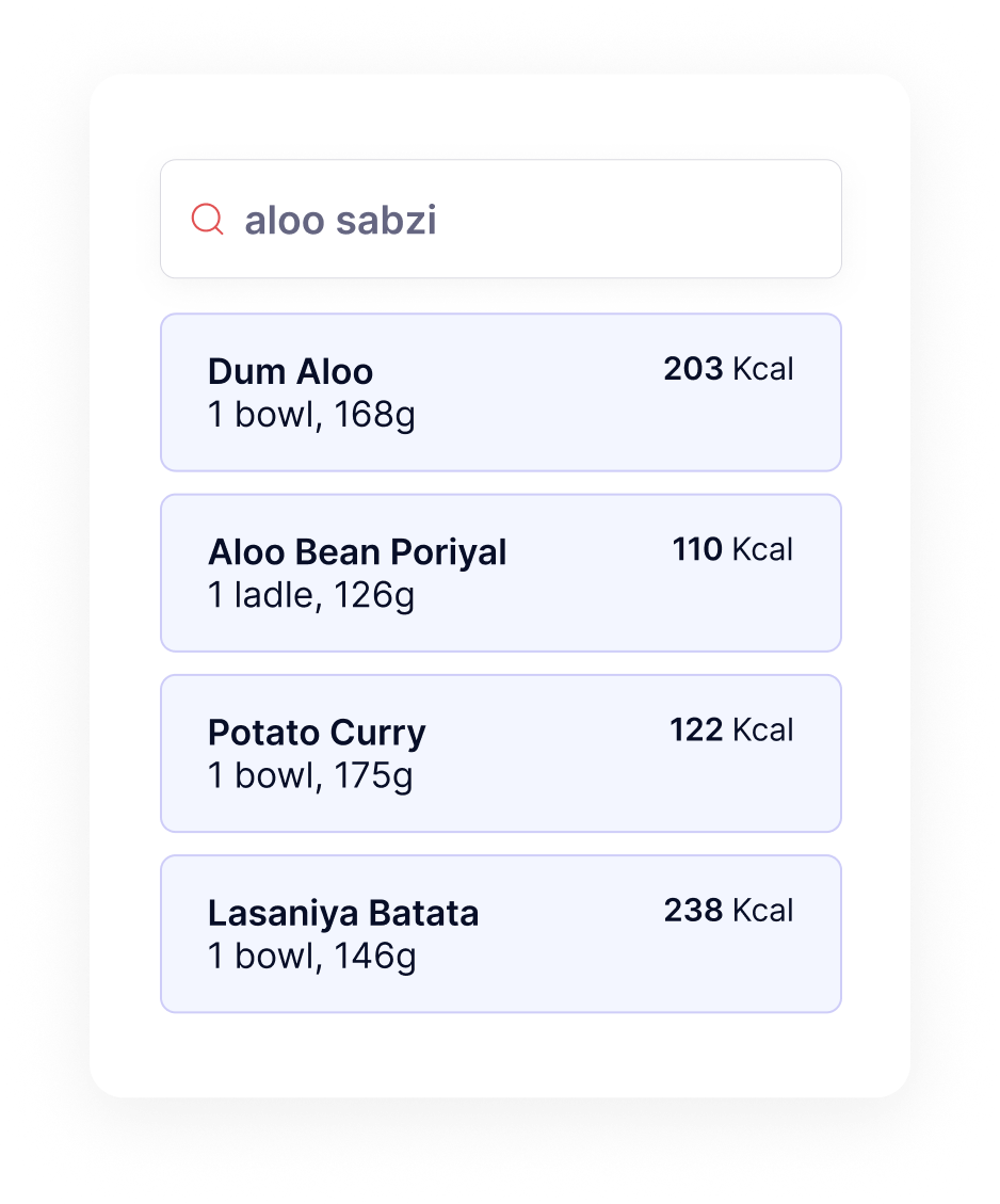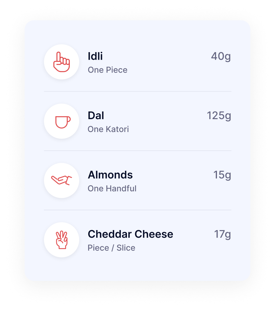 “Handful of nuts”, “1 cup cooked rice”, or “1 ladle sabzi” – we match how Indians plate their food.